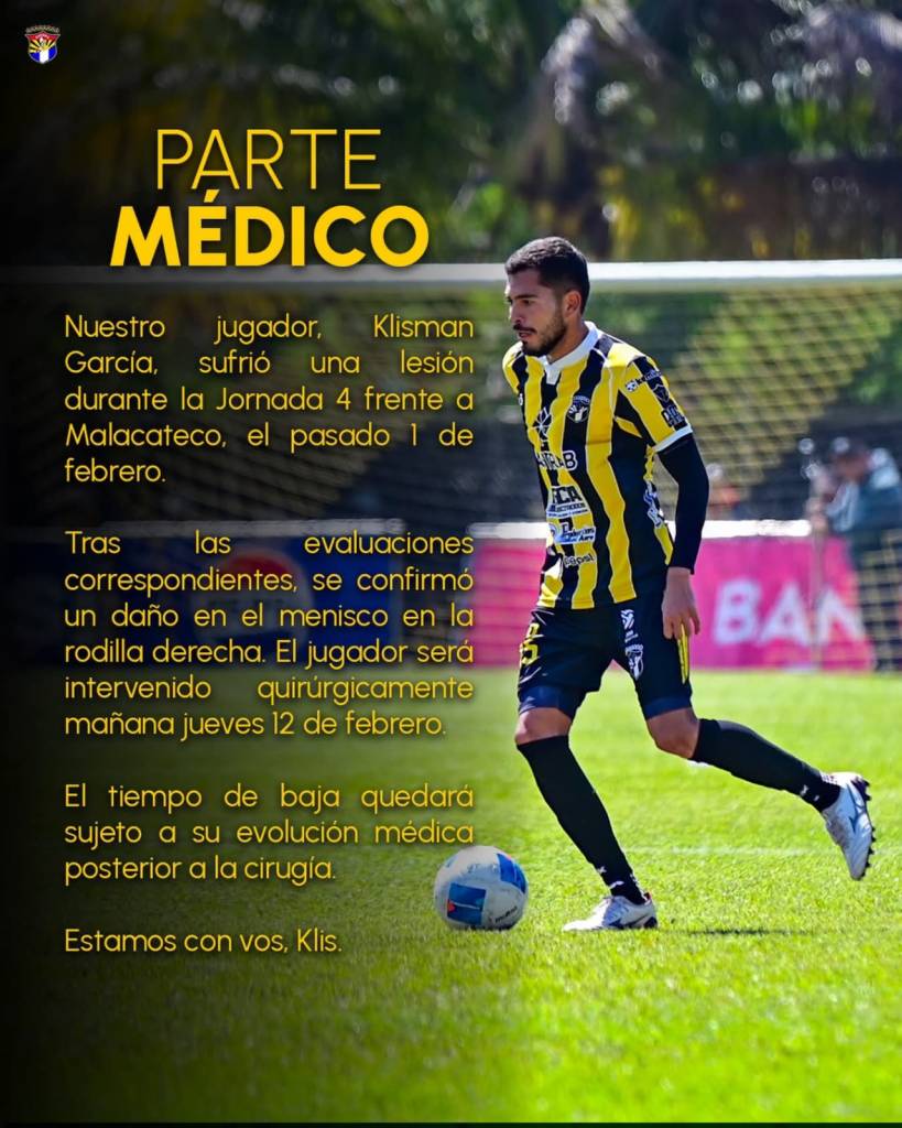 El futbolista de Aurora F. C., Klisman García, será intervenido quirúrgicamente hoy jueves 12 de febrero debido a una lesión en el menisco de la rodilla izquierda, informó el club capitalino en un comunicado difundido mediante redes sociales.