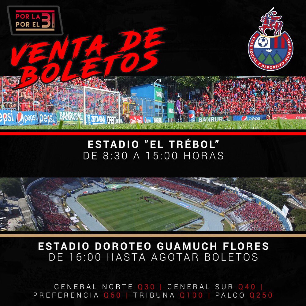 Originalmente las entradas podían ser adquiridas en las taquillas del Estadio Nacional Doroteo Guamuche Flores, pero el club informó un cambio de última hora y ahora están disponibles en el Estadio Manuel Felipe Carrera del Trébol.