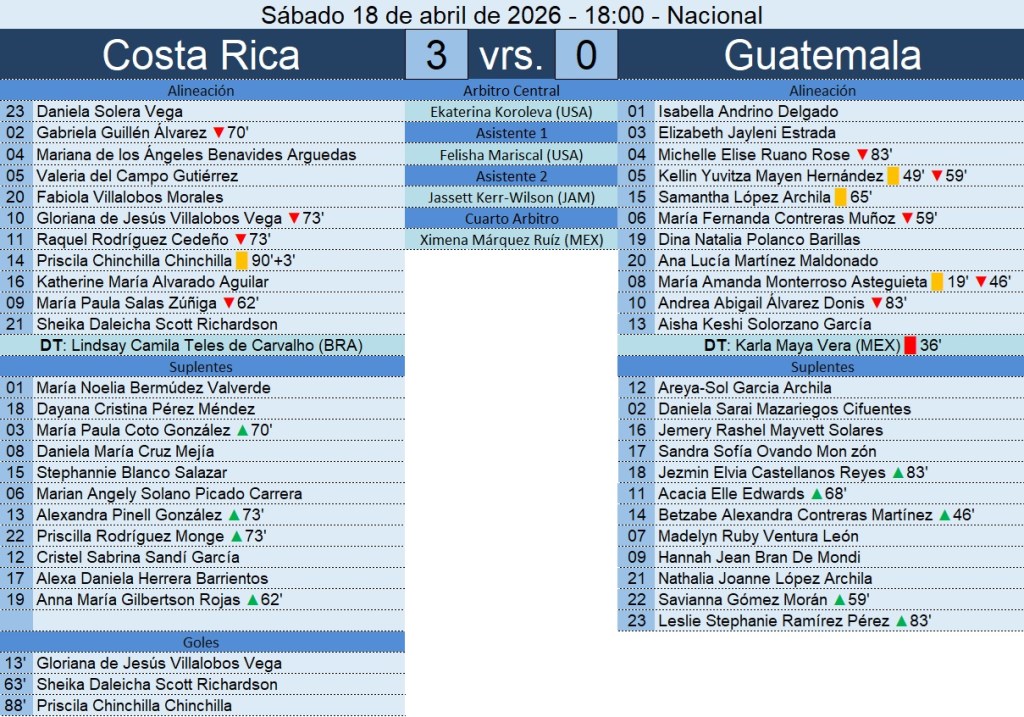 Clasificatorio Concacaf Femenino – Costa Rica 3-0 Guatemala – 18/04/2026