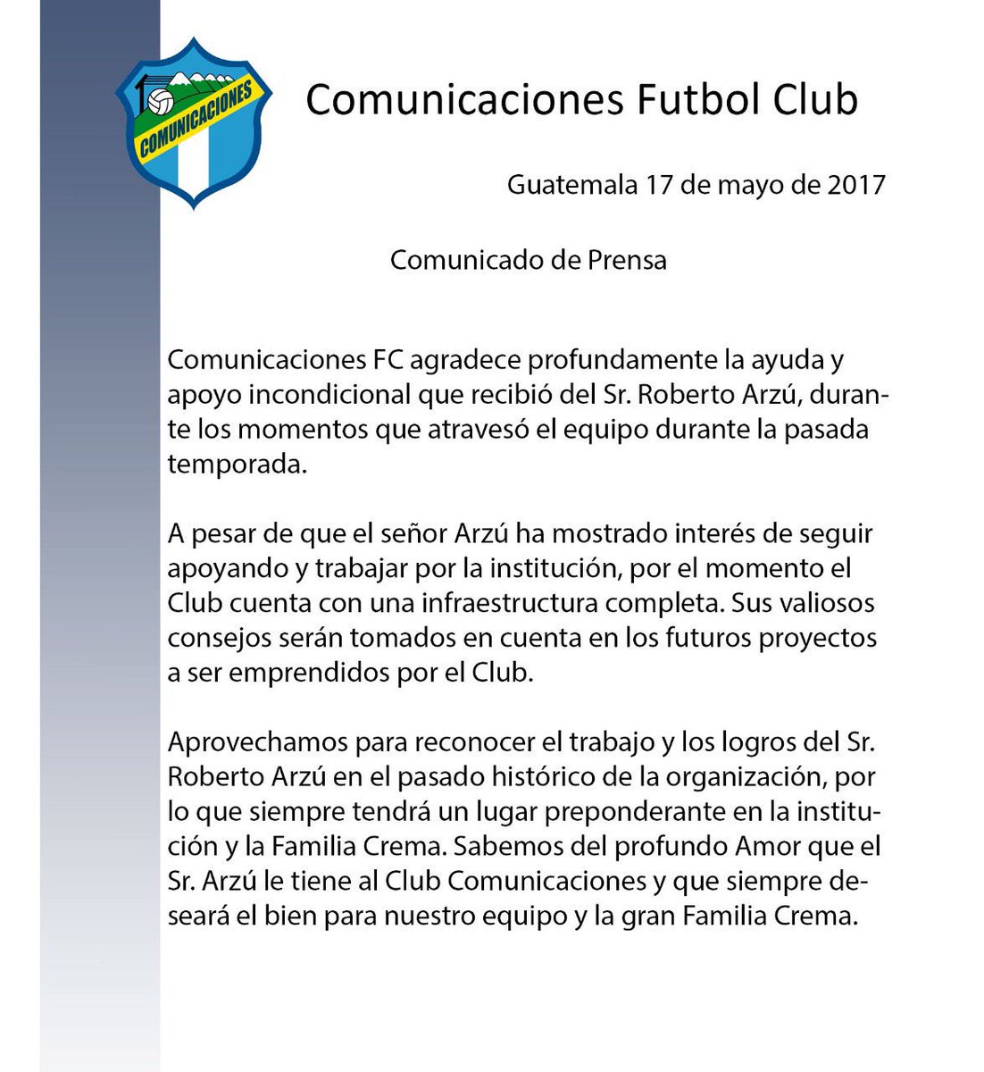 Comunicaciones finalizó su papel en el actual Torneo Clausura, siendo superado por Suchitpéquez en la Liguilla. Tras el resultado el cuadro albo terminó por agradecer el apoyo del expresidente de la institución, Roberto Arzú. Este es el comunicado.