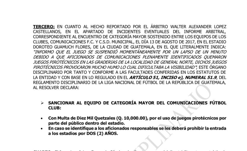 El Órgano Disciplinario de la Liga Nacional, decidió multar a Comunicaciones, por el uso de pirotecnica en el inicio del Clásico 299, disputado en el Estadio Nacional Doroteo Guamuche Flores.