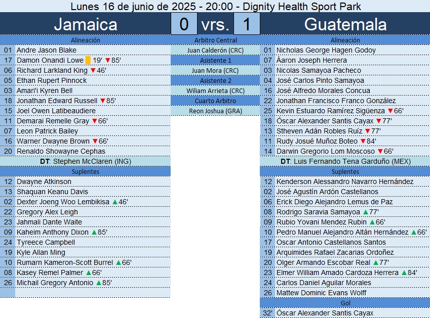 Triunfo importante para Guatemala sobre Jamaica este 16 de junio de 2025 en el Dignity Health Sport Park. El gol de Óscar Santis en el minuto 32 selló un duelo parejo donde el planteamiento de Luis Fernando Tena superó al del técnico inglés Stephen McClaren. Este amistoso dejó sensaciones clave de cara a los próximos retos en CONCACAF.