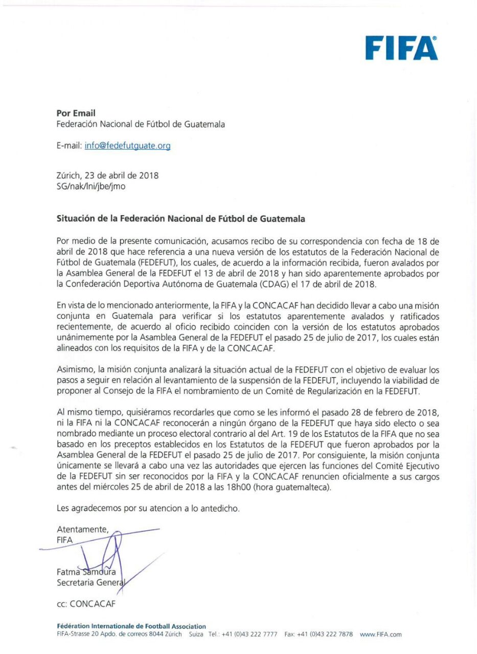 Según indica la misiva, la FIFA enviará una Comisión de Regularización, para evaluar si todos los estatutos y leyes han sido aprobados por la asamblea general. Para ello, indicó que la actual junta directiva de la Fedefut, la cual no es reconocida por la FIFA, deberá renunciar al cargo, antes del miércoles 25 de abril a las 6 de la tarde.
