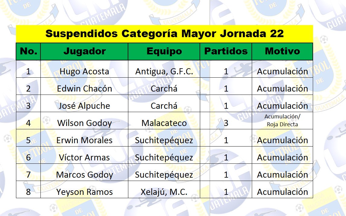 El cuadro venado es el más afectado por la acumulación de tarjetas, tres de sus jugadores están suspendidos para el juego de ida ante los albos. En tanto Xelajú tiene un suspendido para el choque frente a Guastatoya.