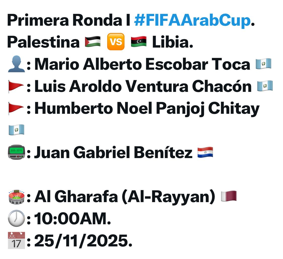 Tres árbitros guatemaltecos, Mario Escobar, Luis Ventura y Humberto Panjoj, participarán en la Copa Árabe de la FIFA 2025, que se celebrará en Qatar. La designación por parte de la FIFA destaca la proyección y el crecimiento del arbitraje guatemalteco a nivel internacional.