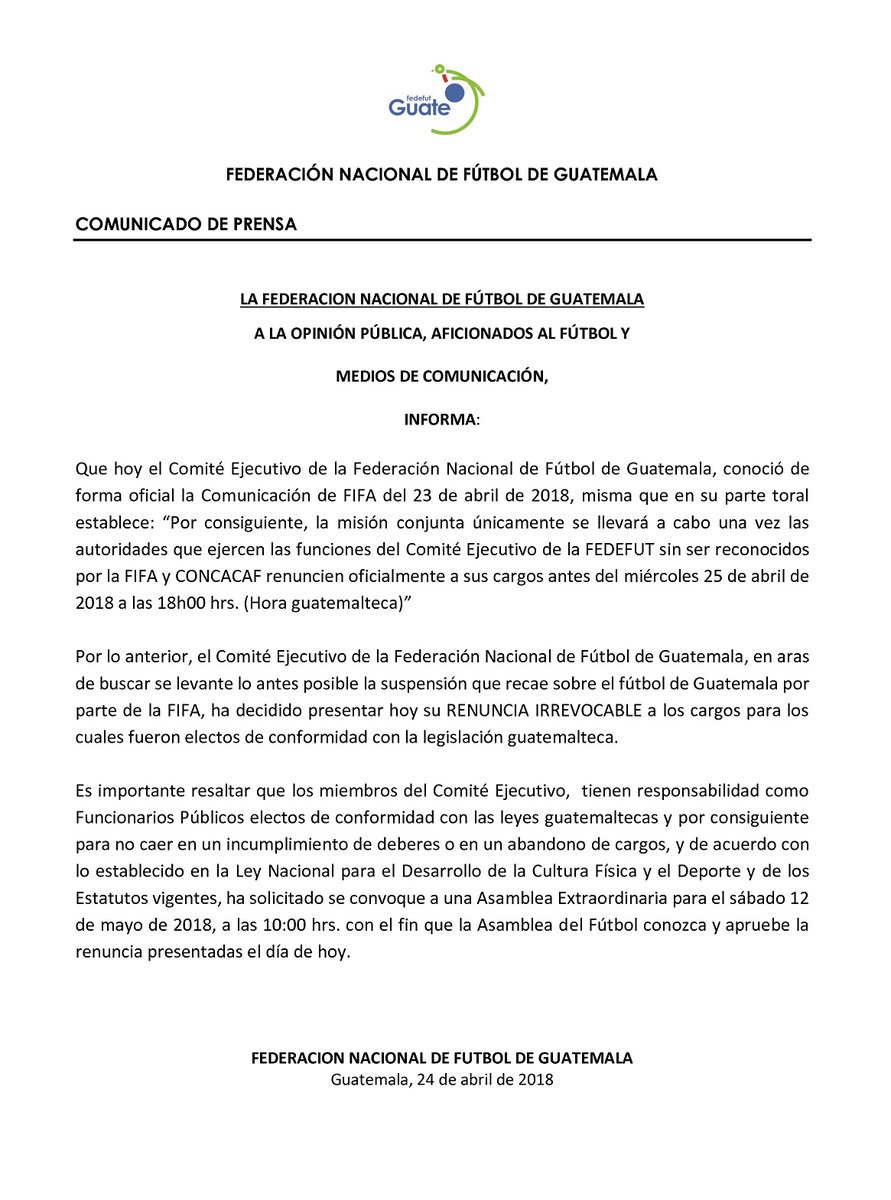 Según dicta el comunicado, la junta liderada por Jorge Mario Veliz, renunció al cargo de manera irrevocable a sus funciones, tal como lo ha demandado la FIFA, para que esta su vez imponga una Comisión de Regularización en el país, con el fin de levantar la suspensión al futbol guatemalteco.