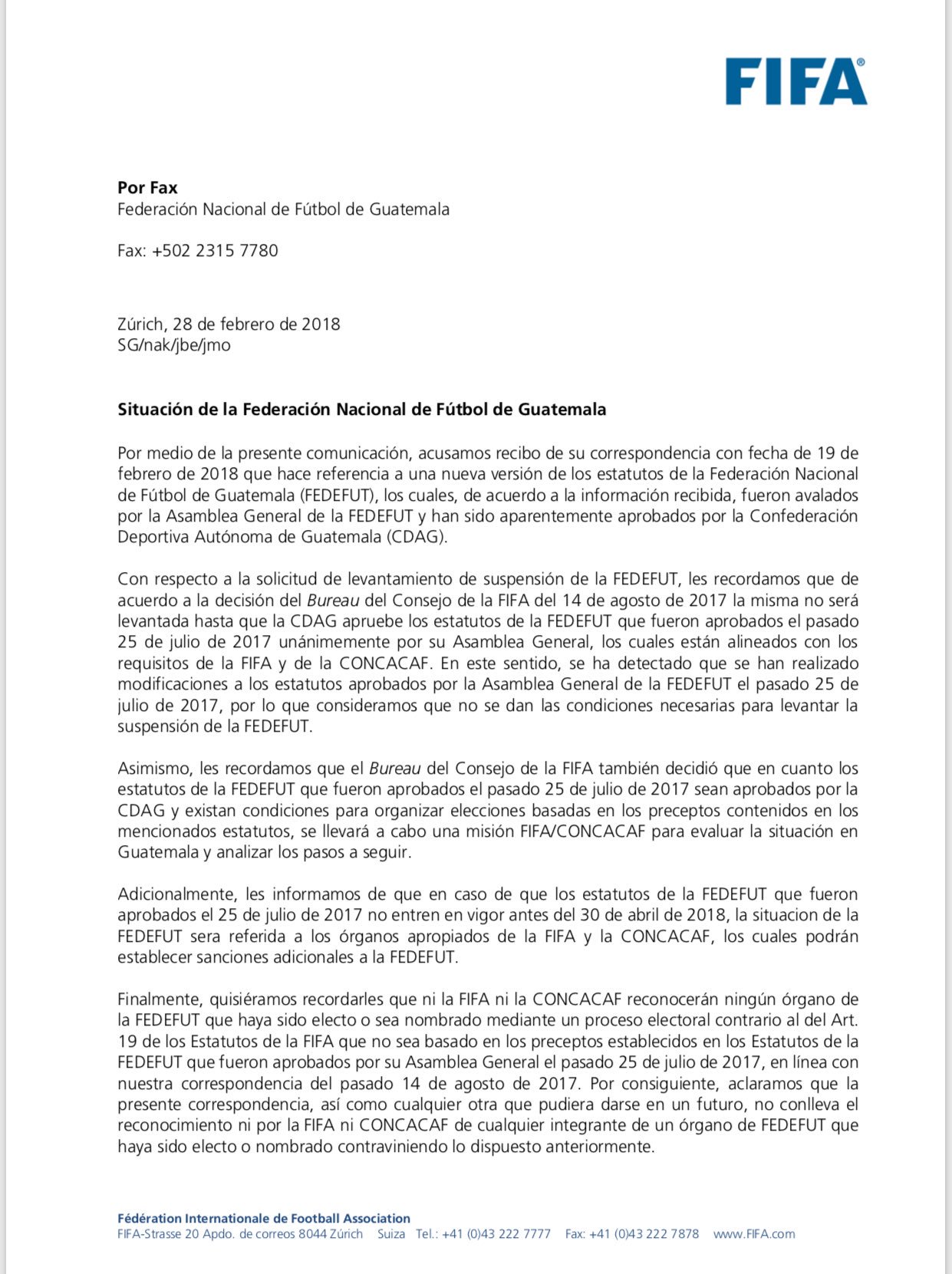Por medio de la presente comunicación, acusamos recibo de su correspondencia con fecha de 19 de febrero de 2018 que hace referencia a una nueva versión de los estatutos de la Federación Nacional de Fútbol de Guatemala (FEDEFUT), los cuales, de acuerdo a la información recibida, fueron avalados por la Asamblea General de la FEDEFUT y han sido aparentemente aprobados por la Confederación Deportiva Autónoma de Guatemala (CDAG).