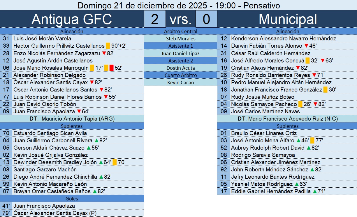 Liga Nacional – Final de Ida – Antigua GFC 2-0 Municipal – 21/12/2025