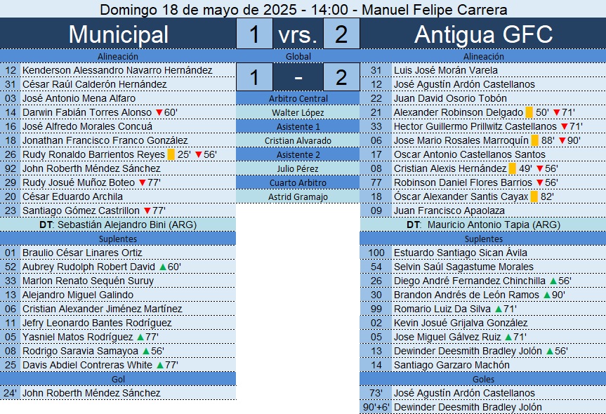 Liga Nacional – Final de Vuelta – Municipal 1-2 Antigua GFC – 18/05/2025