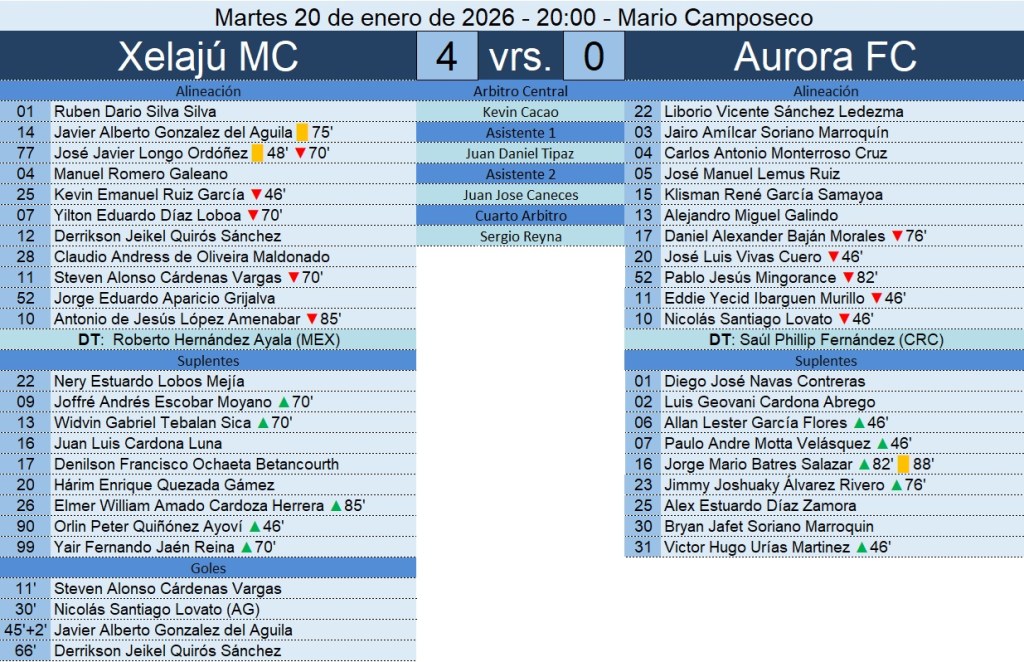 Liga Nacional – Jornada 1 – Xelajú MC 4-0 Aurora FC – 20/01/2026