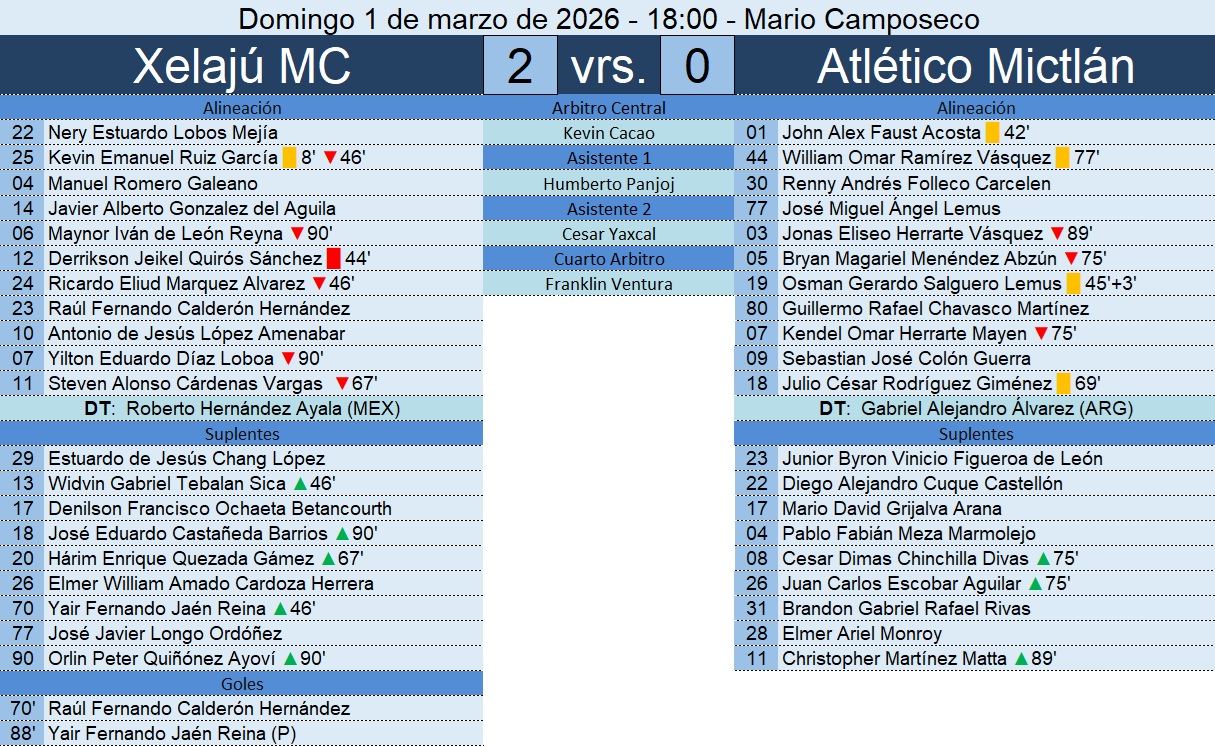 Liga Nacional – Jornada 10 – Xelajú MC 2-0 Atlético Mictlán – 01/03/2026
