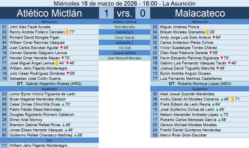 / 1 hora agoLiga Nacional – Jornada 14 – Atlético Mictlán 1-0 Malacateco – 18/03/2026