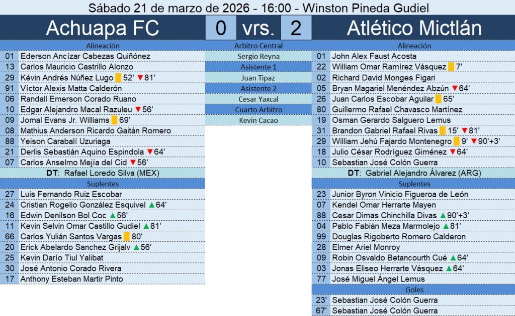 Liga Nacional – Jornada 15 – Achuapa FC 0-2 Atlético Mictlán – 21/03/2026