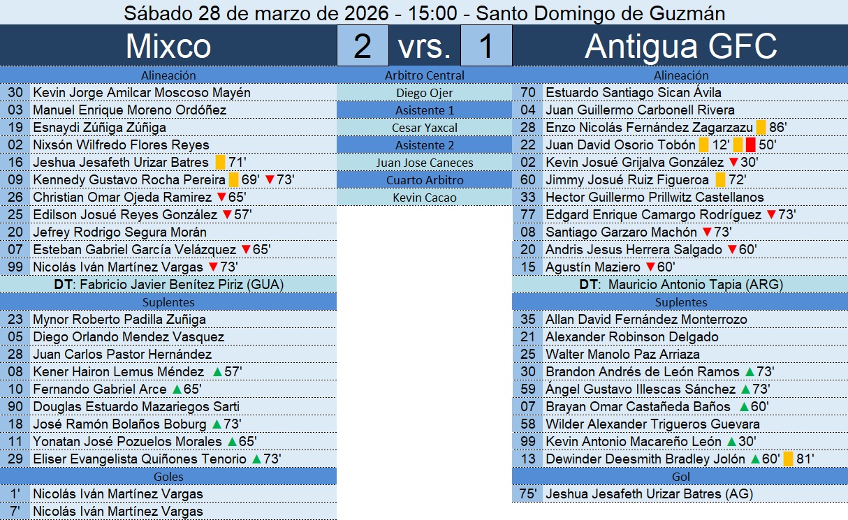 Liga Nacional – Jornada 16 – Mixco 2-1 Antigua GFC – 28/03/2026