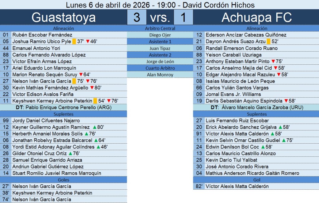 Liga Nacional – Jornada 18 – Guastatoya 3-1 Achuapa FC – 06/04/2026