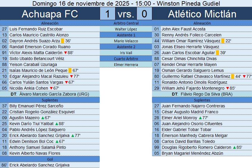 Liga Nacional – Jornada 20 – Achuapa FC 1-0 Atlético Mictlán – 16/11/2025