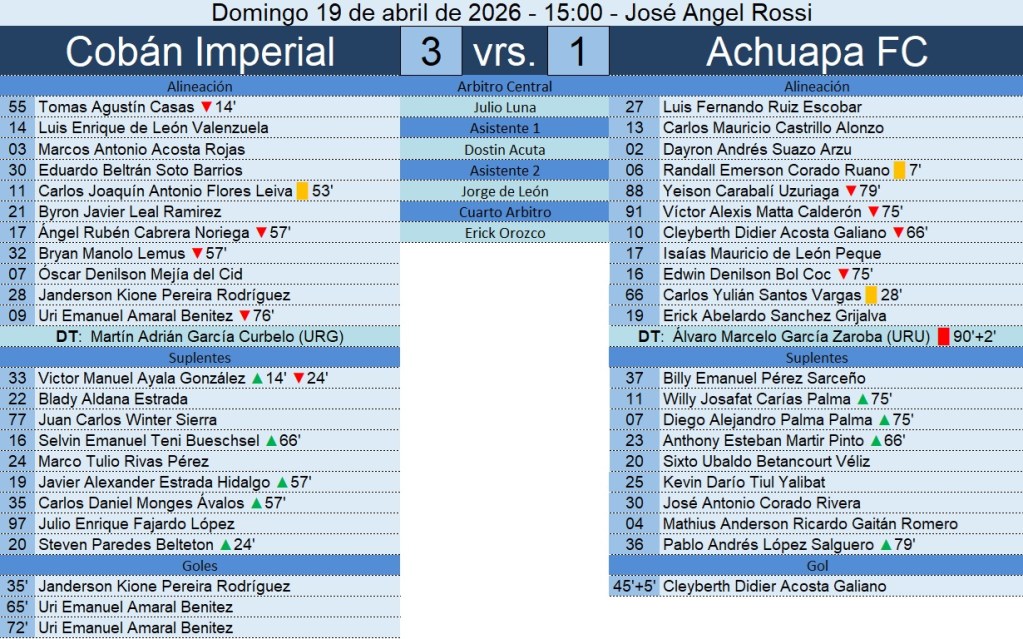 Liga Nacional – Jornada 21 – Cobán Imperial 3-1 Achuapa FC – 19/04/2026