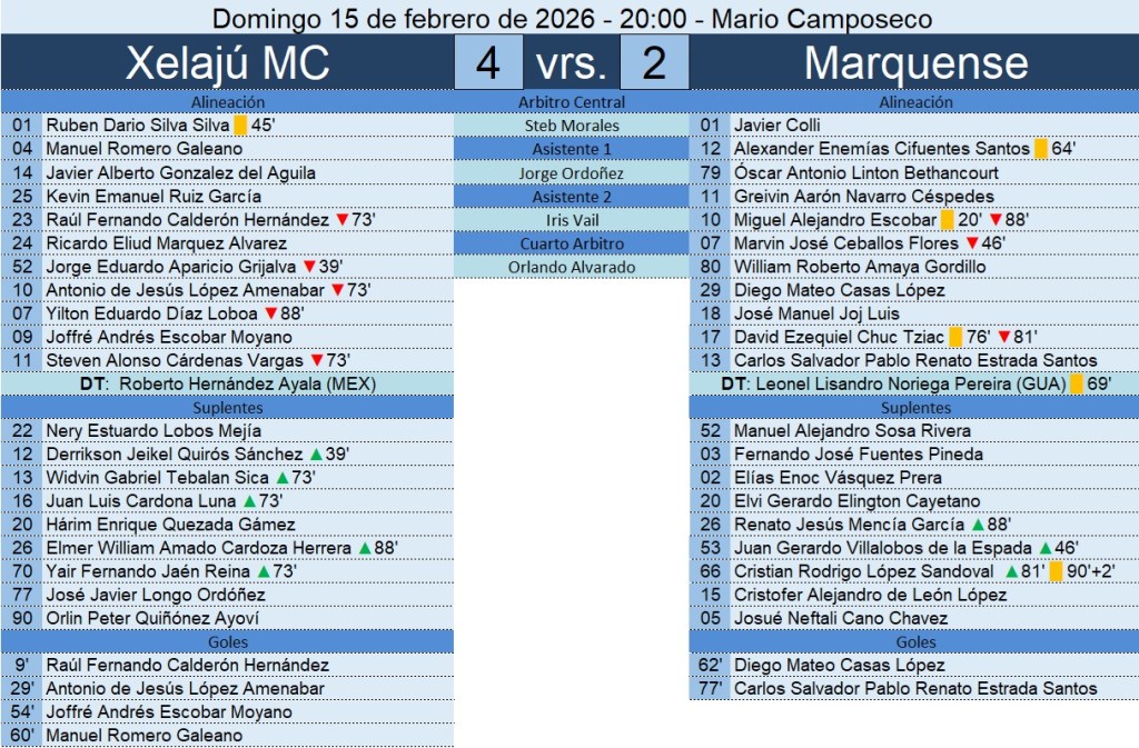 Liga Nacional – Jornada 6 – Xelajú MC 4-2 Marquense – 15/02/2026
