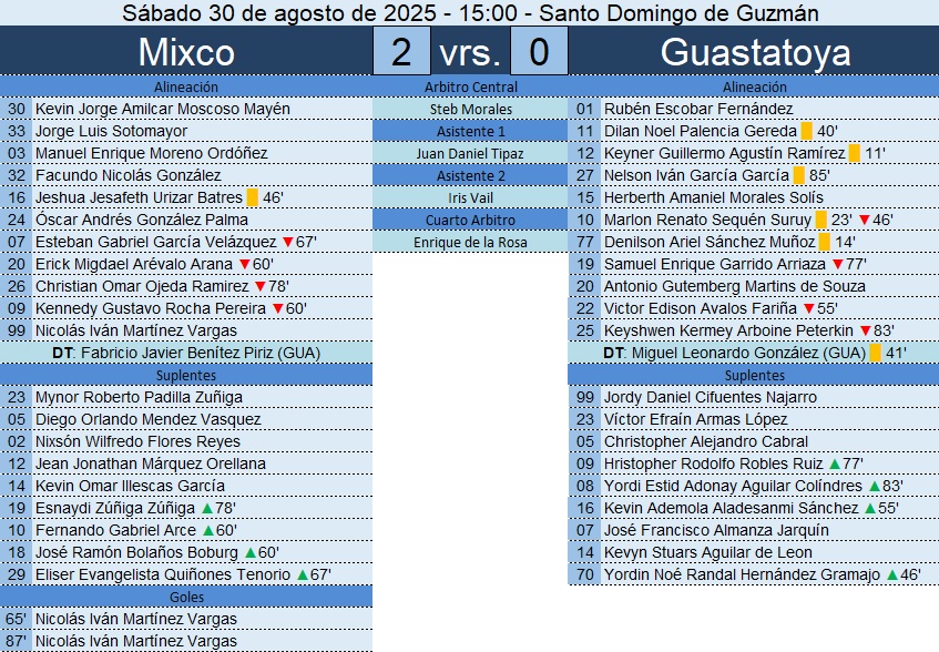 Liga Nacional – Jornada 7 – Mixco 2-0 Guastatoya – 30/08/2025