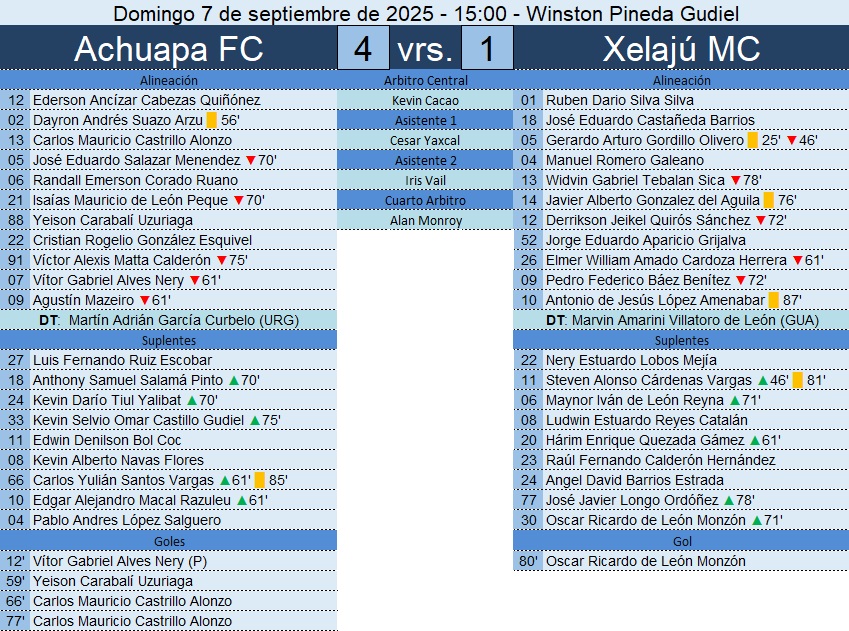 Liga Nacional – Jornada 8 – Achuapa FC 4-1 Xelajú MC – 07/09/2025