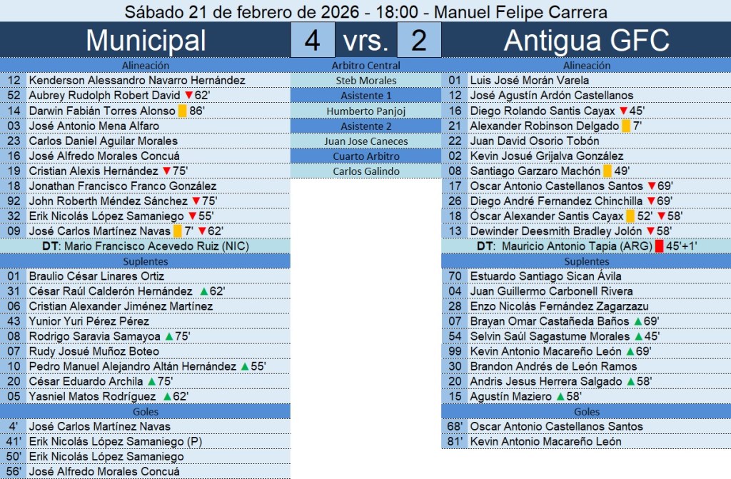 Liga Nacional – Jornada 8 – Municipal 4-2 Antigua GFC – 21/02/2026