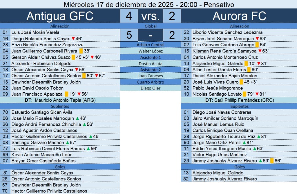 Liga Nacional – Semifinal de Vuelta – Antigua GFC 4-2 Aurora FC – 17/12/2025