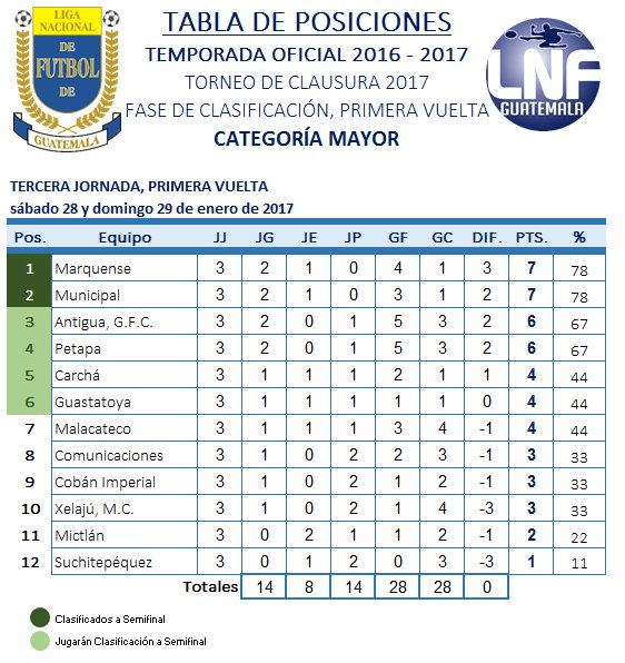 Marquense se ha colocado en la primera casilla de la clasificación del Torneo Clausura, tras sumar 7 puntos, disputadas 3 jornadas del certamen. Sumado a la derrota de Antigua quien hasta entonces se colocaba como el puntero. La derrota de los panzas verdes llegó a costa de Municipal, quien es segundo en la tabla.