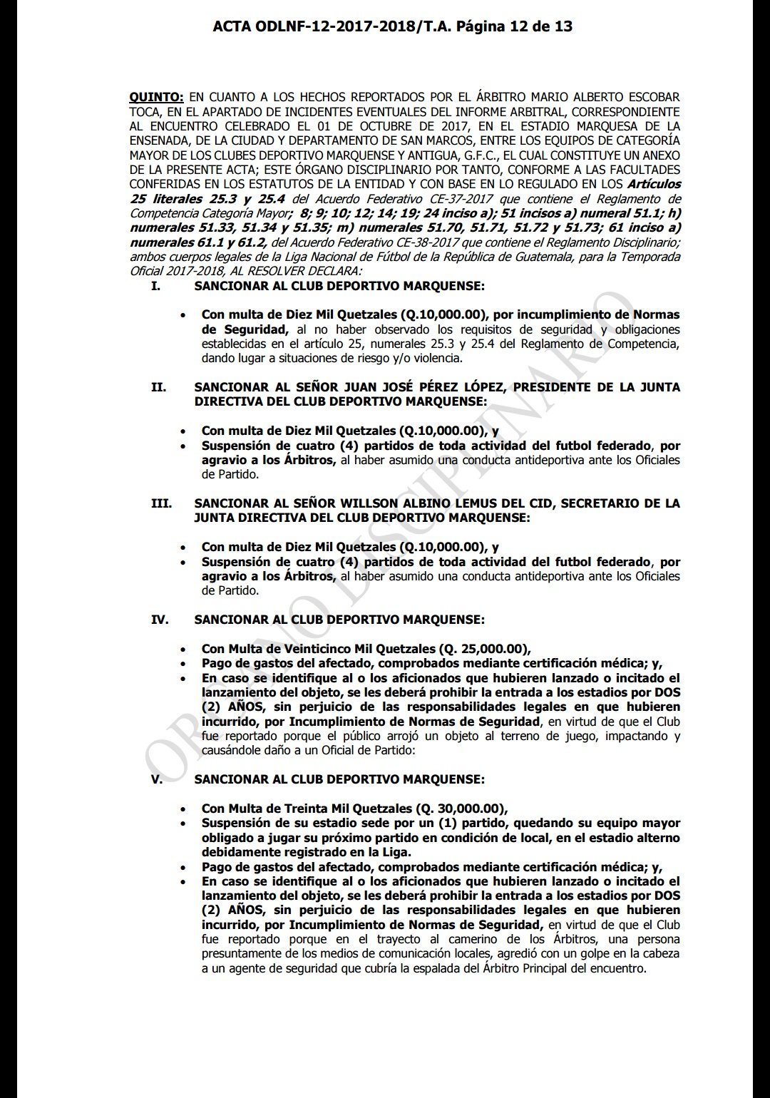 Según indica el acta, Marquense deberá pagar una fuerte suma, debido al incumplimiento de normas de seguridad, lanzamiento de objetos y agresiones a los árbitros del encuentro, que sostuvo el equipo en el Estadio Marquesa de la Ensenada frente a Antigua GFC, partido que finalizó con marcador de 2-2.