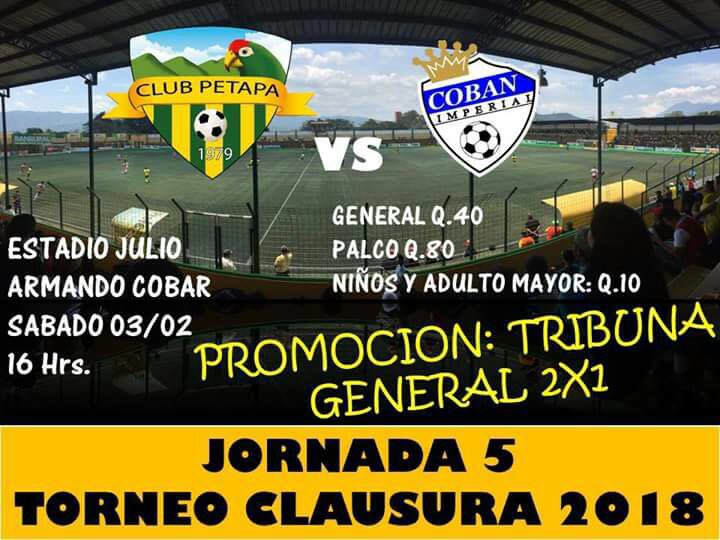 Petapa y Cobán han reprogramdo el juego de la fecha cinco del Torneo Clausura 2018, para esté sábado por la tarde.