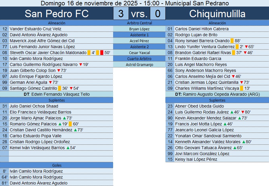 Primera División – Semifinal de Ida – San Pedro FC 3-0 Chiquimulilla – 16/11/2025