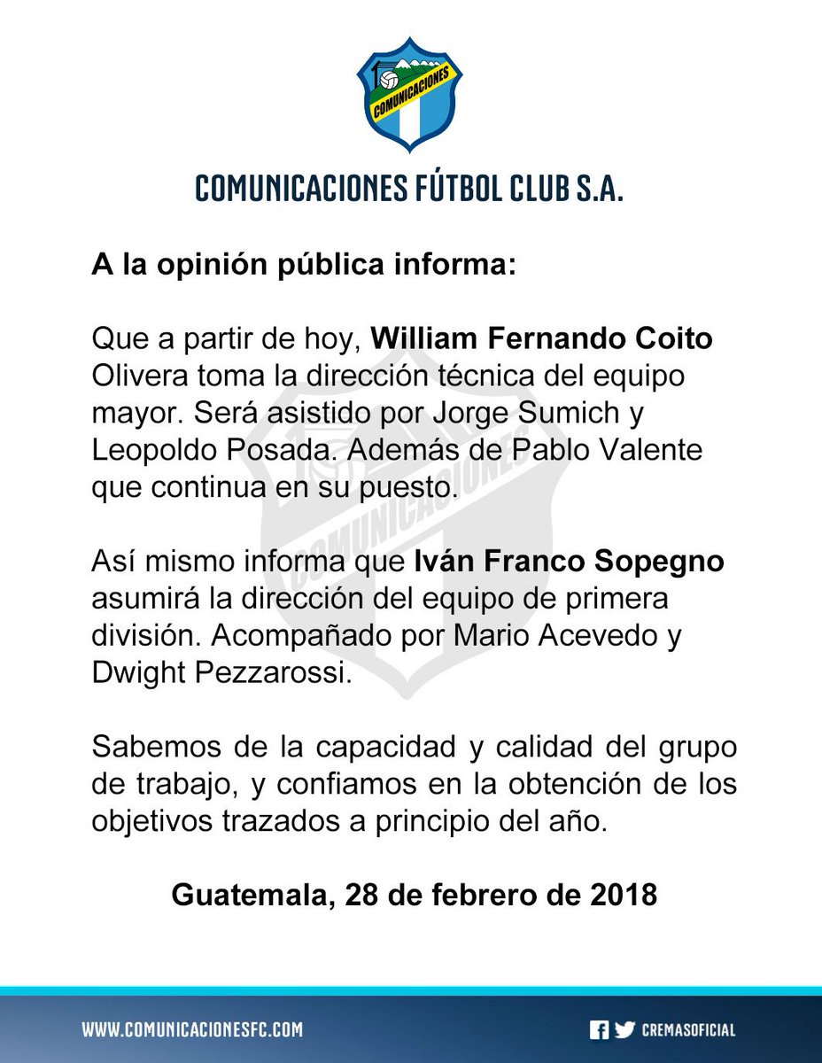 Comunicaciones anunció este miércoles, que el entrenador Willy Coito Olivera, tomará la dirección técnica del equipo, tras la salida de Ronald González.