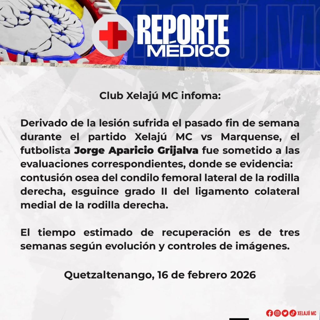 Xelajú confirmó a través de un comunicado oficial emitido en Quetzaltenango, el parte médico del futbolista Jorge Aparicio Grijalva, quien salió lesionado durante el reciente encuentro ante Marquense.